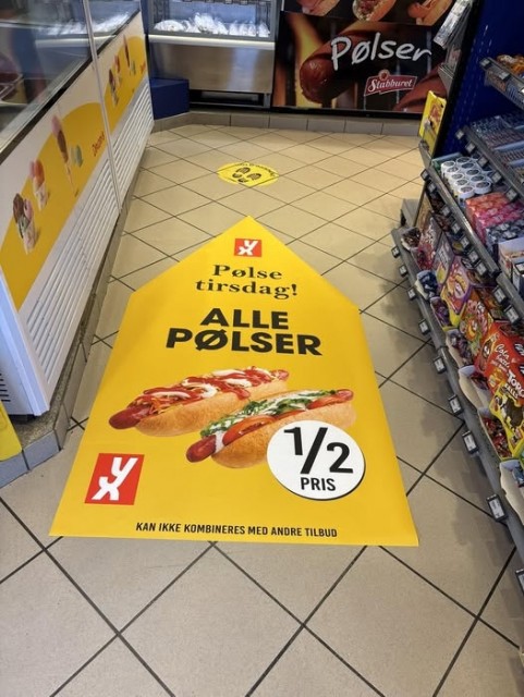 Vi har brukt gulvreklamen én dag i uken i forbindelse med kampanjen "Pølsetirsdag", og ser en tydelig økning i salget på disse dagene.